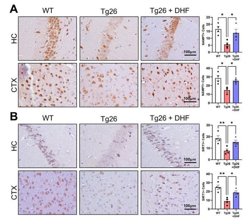Figure 4: Downregulation of NAD+-related enzymes NAMPT and SIRT1 in Tg26 mouse brains is improved by DHF treatment. Representative images of immunohistochemical staining of (A) nicotinamide phosphoribosyl transferase (NAMPT) and (B) NAD-dependent deacetylase sirtuin-1 (SIRT1) from the hippocampus (HC) and cortex (CTX) of wildtype mice (WT, n = 4); HIV-associated Tg26 mice (Tg26, n = 4); and Tg26 mice treated with DHF (Tg26+DHF, n = 4). Quantifications from 4-7 immunostained and imaged sections were averaged for each biological replicate. Scale bar = 100 µm. (** p < 0.01, * p < 0.05).
