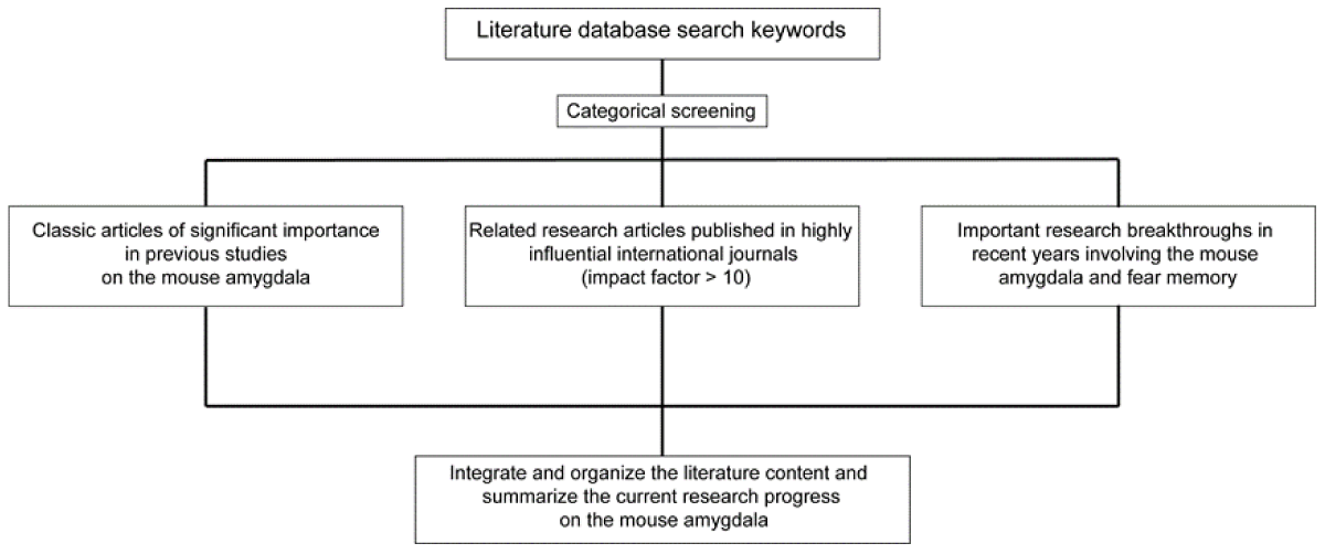 The references cited in this article were primarily sourced from the PubMed database using key search terms including “mouse amygdala,” “basolateral amygdala (BLA),” “central amygdala (CeA),” “fear extinction,” “fear learning,” and “microcircuits.” The inclusion criteria for selected references were defined as follows: first, seminal articles that established fundamental concepts in mouse amygdala research; second, studies published in high-impact international journals (impact factor >10); third, recent breakthroughs elucidating critical mechanisms of amygdala-mediated fear memory processes. Articles meeting any of these criteria were included as candidate references (Figure 1). After a comprehensive evaluation of all candidate literature, the authors objectively synthesized the scientific perspectives presented in these studies. This work declares no conflicts of interest with any cited authors or institutions, and the interpretation of referenced content was conducted with strict adherence to academic neutrality.