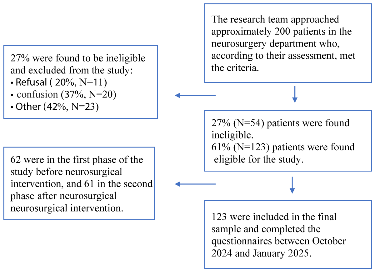 The study participant included adult patients over the age of 18 who were hospitalized in the neurosurgical department of a large medical center in a central medical center in the Middle East during 2024–2025. The patients were hospitalized due to an acute neurosurgical problem or exacerbation of a chronic condition. Patients who were unable to answer the questionnaires due to their condition, such as patients with delirium or unconsciousness, were not invited to participate. Likewise, patients whose condition was defined as terminal were not invited to participate.