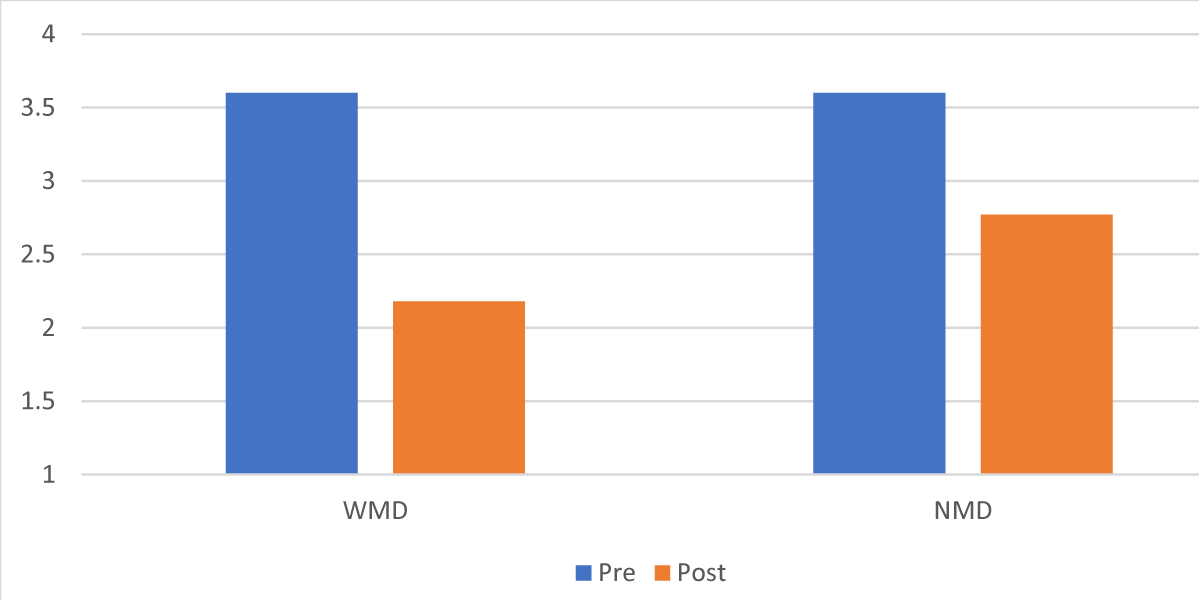 To examine the hypothesis, Analysis of Variance (ANOVA) was conducted: Time of measurement (Pre / Post) X Group (patients / caregivers) with wellbeing as the dependent variable. Two analyses were conducted: for WMD and NMD separately.