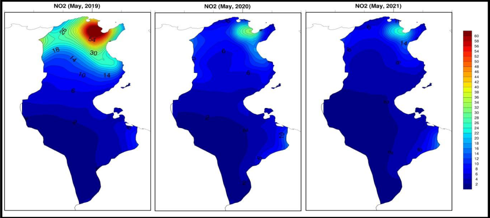 Air quality improved significantly during the first confinement that lasted almost a month and a half (March and April 2020) in Tunisia. This period is characterized by the first wave of the new epidemic that its history began in Wuhan, China at the end of 2019 when the first case of COVID-19 was reported. Later, this epidemic turned into a national crisis, with infected individuals diagnosed across the country [1,3]. Transportation and travel to and from Wuhan have been halted. Then, they closed schools and universities to reduce the spread of the disease and established numerous quarantines [5]. In early March 2020, the World Health Organization (WHO) declared that the epidemic in Wuhan has turned into a global pandemic as several countries in North America and Europe have been affected by COVID-19. Italy, France, Spain and other European countries have started to know several cases affected by this coronavirus, known to be very contagious. The WHO has launched several recommendations to curb the spread of this virus and to call for the establishment of general confinement in the affected countries. Following the two-week confinement in Tunisia, on March 22, 2020, travel between towns was banned. Factories have been closed to limit human damage. A dramatic decrease in Nitrogen dioxide (NO2), Sulfur dioxide (SO2) and Carbon monoxide (CO), which are polluting gases caused mainly by human activities, was observed during the confinement period in several Tunisian cities and in particular in the North and in the Center, using satellite measurements of the European center with the European Earth monitoring program – COPERNICUS. The data was analyzed and developed at the National Institute of Meteorology of Tunisia. Following these successive events, the air quality improved markedly during these confinement periods of 2020 and 2021; known as the COVID-19 first wave [4]. A spectacular fall in Nitrogen dioxide (NO2), Sulfur dioxide (SO2) and Carbon monoxide (CO) produced mainly by human activities, was observed during these periods and after, especially in May 2020 and 2021, in several Tunisian regions and in particular in the North (Grand-Tunis and neighboring regions) using satellite measurements of Sentinel-5P (Figures 2-4). As NO2 is a common tracer of air pollution linked to human activity and associated with morbidity and mortality [6-9], NASA scientists said that the reduction in this pollutant (NO2) appeared first near Wuhan, but spread to the rest of the country and eventually worldwide [9,10]. Also, Northern Italy and France saw a reduction of nearly 50% of their NO2 emissions during this confinement period. In central China, NO2 emissions have been reduced by almost 25% [11]. SO2 emissions, another common marker of air pollution, have fallen by over 50% in northern Tunisia (Figure 5), Mumbai, New York and Los Angeles by nearly 33%, Madrid at 50%, Seoul by 50% and Wuhan by 42% [12]. Air pollution is responsible for many deaths and an increased incidence of respiratory illnesses [13]. According to the World Health Organization (WHO), nearly 4.6 million people die each year from diseases related to poor air quality [14,15], responsible for more deaths each year than motor vehicle accidents [16]. Deaths associated with air pollution include, but are not limited to, aggravated asthma, bronchitis, emphysema, lung and heart disease and respiratory allergies [13]. China, where the COVID-19 epidemic began, is also a country severely affected by air pollution [7,8]. Air pollution in China is responsible for 4,000 deaths every day, or 1, 6 million deaths in 2016 [17,18]. Scientific studies have mentioned that mortality due to air pollution represents a rate of 0.13% per day [7,8] to 2% for 10 μg/m3 of NO2 over a period of 5 days [19,20]. Considering the huge decrease in air pollution following quarantine around the world, the COVID-19 pandemic paradoxically could have reduced the total number of deaths during this period, by drastically reducing the number of deaths due to air pollution. Moreover, in addition to the number of reduced deaths from air pollution, the reduction in this list could also have positive benefits in reducing preventable no transmissible diseases.