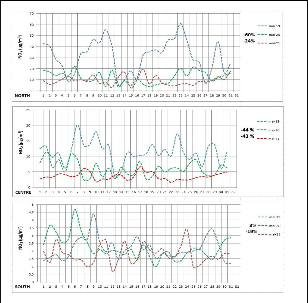 Figure 6: Daily mean of the surface Nitrogen dioxide concentration (NO2, µg/m3) for North, Centre and South of Tunisia for the May, 2019-2021 period.